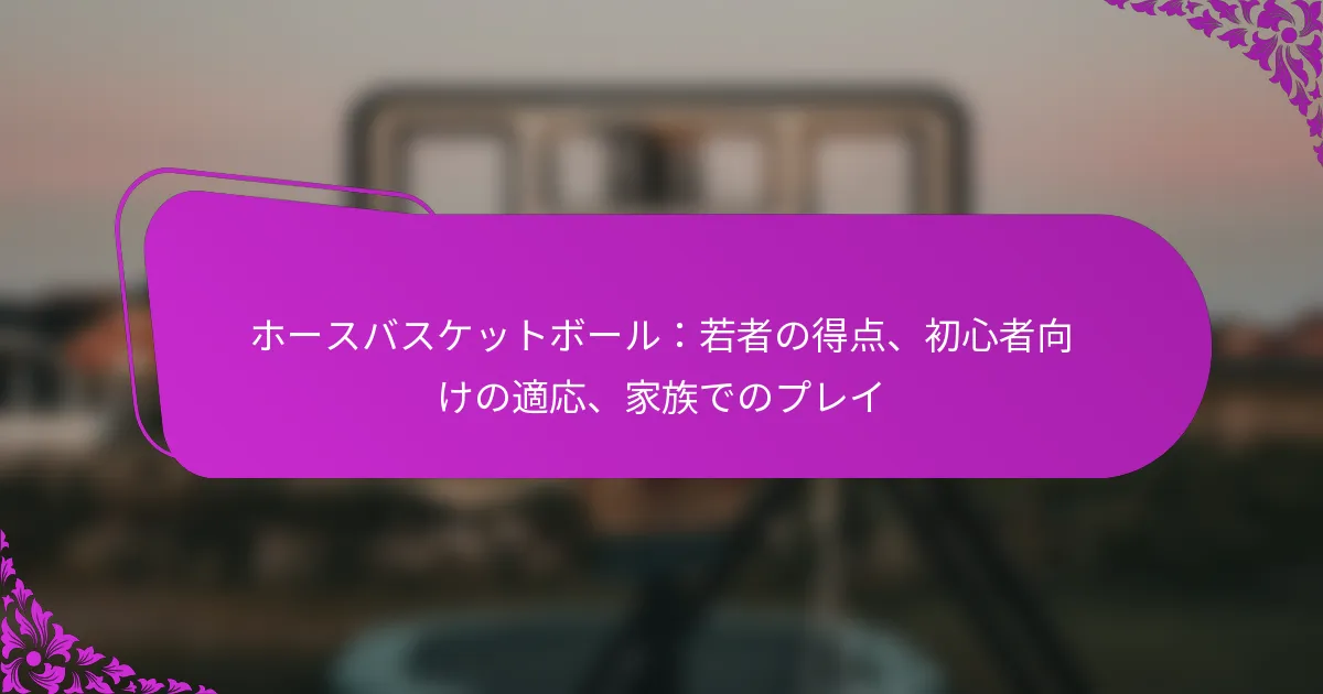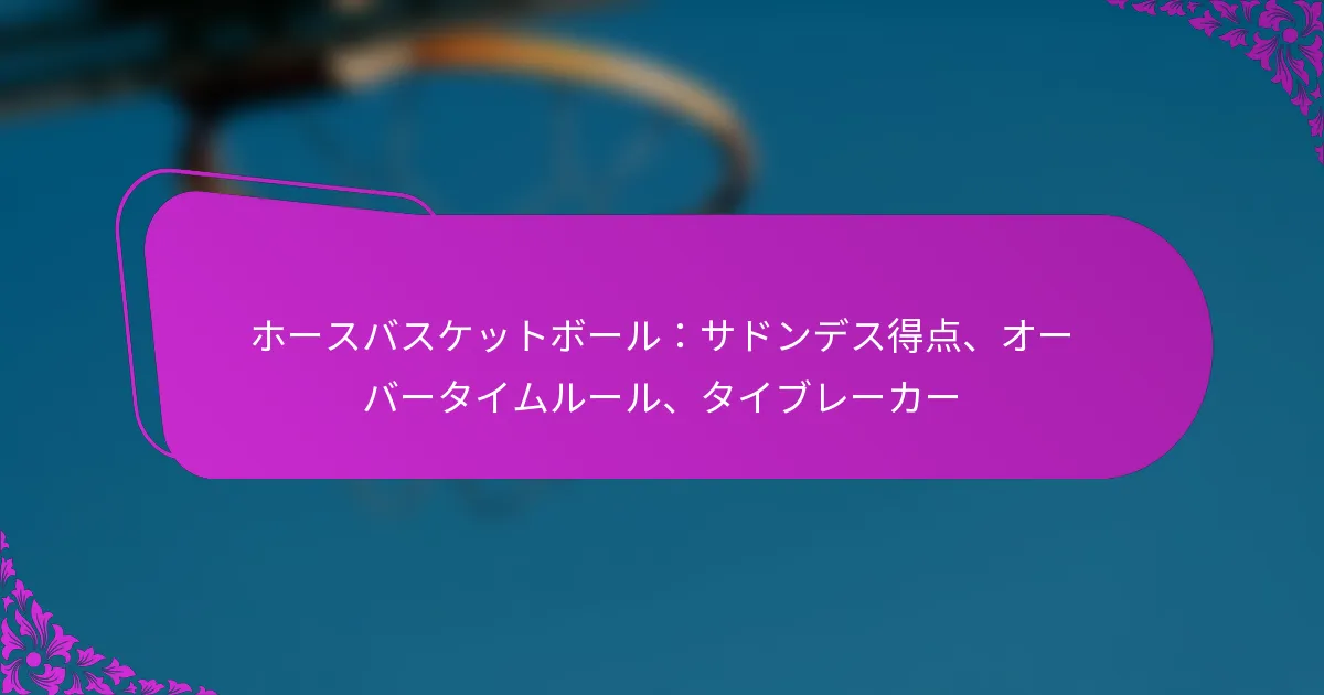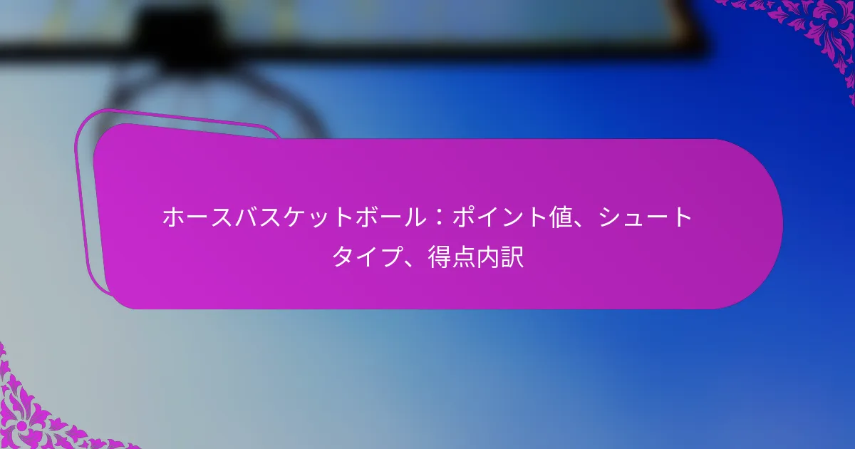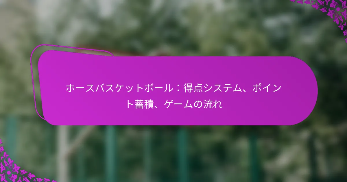 ホースバスケットボールは、バスケットボールと創造性を融合させたユニークなゲームで、プレイヤーが想像力豊かなシュートを通じて得点を獲得することができます。得点システムは正確さとスキルを重視し、プレイヤーがパフォーマンスに基づいてポイントを蓄積することでゲームの流れに影響を与えます。これらのルールを理解することは、プレイヤーと観客の両方がこの遊び心満載の伝統的なバスケットボールのひねりに関わる戦略を十分に楽しむために重要です。 ホースバスケットボールとは何か、従来のバスケットボールとの違いは? ホースバスケットボールは、バスケットボールの要素を遊び心のあるひねりで組み合わせたユニークなゲームで、プレイヤーが創造的なシュートを通じて得点を獲得します。チームワークや構造化されたプレイを重視する従来のバスケットボールとは異なり、ホースバスケットボールは個々のスキルと創造性に焦点を当てており、すべての年齢やスキルレベルのプレイヤーが楽しむことができます。 ホースバスケットボールの定義と起源 ホースバスケットボールは、プレイヤーがコート上のさまざまな場所からシュートを試みるカジュアルなゲームです。1人のプレイヤーがシュートを成功させると、他のプレイヤーはそれを再現しなければなりません。再現できない場合、そのプレイヤーは「H」から始まる文字を受け取り、「O」、「R」、「S」、「E」と進んでいきます。ゲームは、あるプレイヤーが「HORSE」と綴ると終了し、そのプレイヤーはゲームから排除されます。 このゲームは20世紀初頭に、バスケットボール愛好者が楽しみながらシュートスキルを練習する方法として始まりました。それ以来、すべての年齢のプレイヤーの間で人気のある娯楽に進化し、ドライブウェイ、公園、ジムでよくプレイされています。 ホースバスケットボールと従来のバスケットボールの主な違い ゲームプレイの構造:ホースバスケットボールは非公式で個々のシュートに焦点を当てているのに対し、従来のバスケットボールはチーム、プレイ、構造化された得点システムを含みます。 得点メカニクス:ホースバスケットボールでは、プレイヤーは成功したシュートを再現することで得点を獲得しますが、従来のバスケットボールではシュートの位置に基づいてポイントが得られます(2点または3点)。 チームダイナミクス:ホースバスケットボールは通常1対1または小グループでプレイされますが、従来のバスケットボールはより大きなチームと協調した戦略を含みます。 時間制約:ホースバスケットボールには時間制限がなく、リラックスしたペースでプレイできるのに対し、従来のバスケットボールにはタイムドクォーターがあります。 ホースバスケットボールの一般的な別名とバリエーション ホースバスケットボールはさまざまな名前で知られており、いくつかの人気のあるバリエーションがあります。一般的な別名には「H-O-R-S-E」、「Pig」、「Gorilla」が含まれ、それぞれにゲームプレイのダイナミクスを変える軽微なルールの変更があります。 バリエーションには、特定の場所からシュートを成功させることや片手だけを使用することを要求するなど、異なる得点システムや追加のチャレンジが含まれることがよくあります。これらの適応はゲームの楽しさと創造性を高め、より広い観客にアピールします。 ホースバスケットボールでの得点はどのように行われるか? ホースバスケットボールでは、さまざまなシュートタイプと距離を通じて得点が行われ、正確さとスキルを報いる特定のポイントシステムがあります。ゲームの流れはこれらの得点方法によって影響を受け、プレイヤーはゲームプレイ中のパフォーマンスに基づいてポイントを蓄積します。 ホースバスケットボールで使用される標準得点システム ホースバスケットボールの標準得点システムは、通常、成功したシュートの難易度に基づいて異なるポイント値を割り当てます。一般的に、3ポイントライン内からのシュートは1ポイント、アークの外からのシュートは2ポイントの得点となります。さらに、特定の距離や角度からのシュートなど、特に難しいシュートにはボーナスポイントが与えられることがあります。 一部のバリエーションでは、トリックムーブやユニークなテクニックを含む創造的なシュートにもポイントが与えられることがあります。これにより、プレイヤーは自分のスキルを披露し、ゲームにエンターテインメントの要素を加えることができます。 異なるシュートタイプと距離に対するポイント値