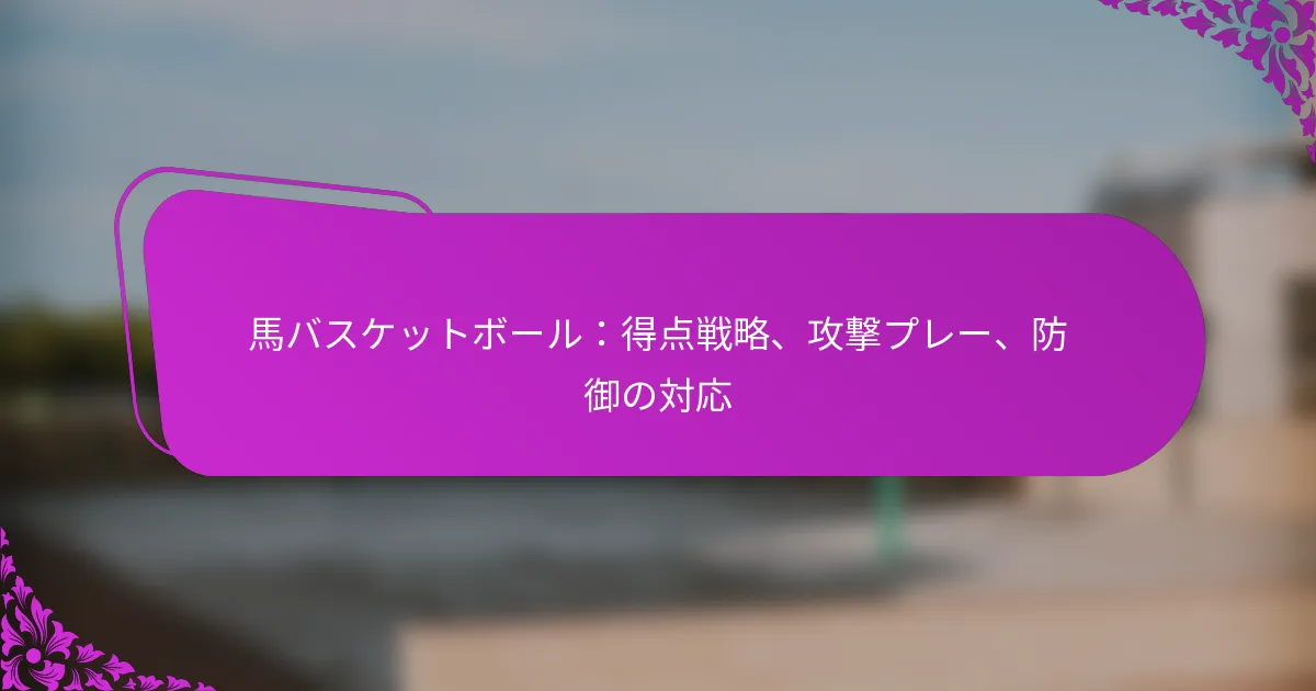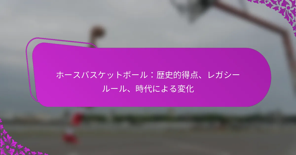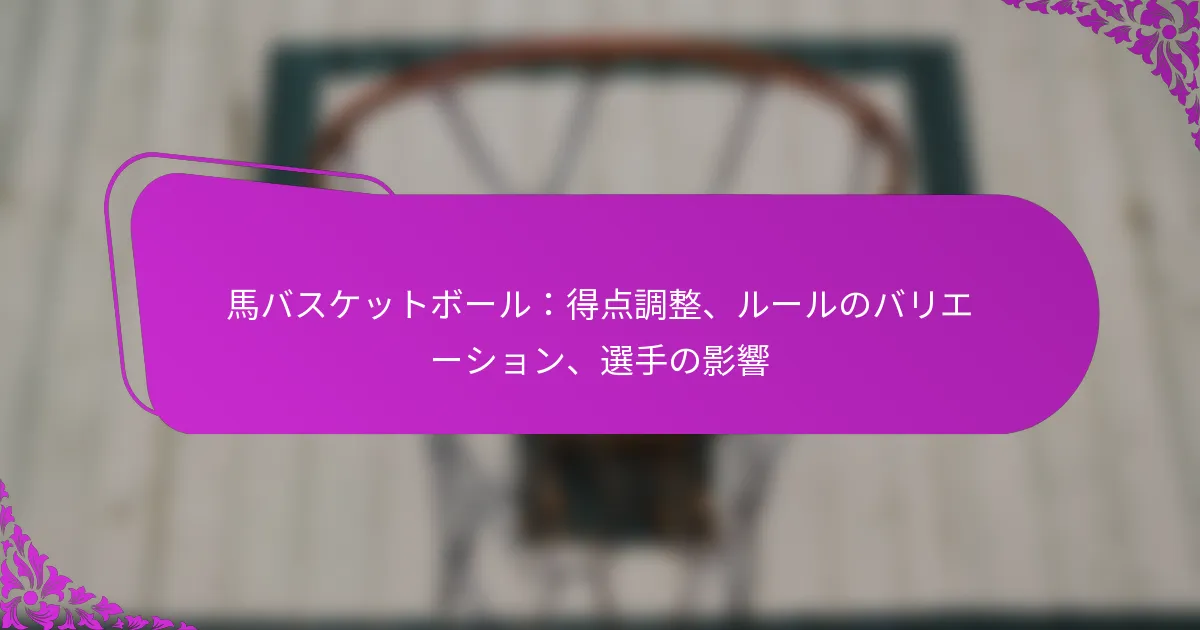 ホースバスケットボールは、バスケットボールの興奮と乗馬のスキルを融合させた革新的なスポーツで、ユニークな競技体験を提供します。年月が経つにつれて、得点システムは進化し、基本的なシュートから、主要な選手や記憶に残る試合に影響を受けたより複雑なルールへと移行しました。ゲームの創設時に確立されたレガシールールは、現在のフォーマットや地域ごとのバリエーションを形成する上で重要な役割を果たしています。 ホースバスケットボールとは何か、どのようにプレイされるのか? ホースバスケットボールは、プレイヤーが馬に乗りながらフープにシュートをする、バスケットボールとクラシックなゲーム「ホース」のユニークな組み合わせです。このゲームは、馬術のスキルとバスケットボールのテクニックを融合させ、魅力的で競争的な体験を生み出します。 ホースバスケットボールの定義と起源 ホースバスケットボールは、伝統的なバスケットボールと乗馬を融合させたスポーツです。プレイヤーは、馬に乗りながらバスケットボールをフープにシュートして得点を目指し、運動能力と馬術を披露します。 ホースバスケットボールの起源は20世紀初頭に遡り、年月とともにさまざまな適応が生まれました。特定の馬術コミュニティで人気を博し、以来、さまざまな地域で認知されたスポーツへと進化しました。 基本ルールと得点システム ホースバスケットボールの基本ルールは、伝統的なバスケットボールに似ていますが、馬術の要素を考慮していくつかの修正が加えられています。各チームは通常3人から5人のプレイヤーで構成され、得点を目指して交代でシュートを試みます。 得点は、バスケットボールをフープに成功裏にシュートすることで達成されます。シュートの距離に応じてポイントが与えられ、近いシュートは少ないポイント、遠いシュートは多くのポイントを得ることができます。一般的な得点システムでは、近距離のシュートで1ポイント、中距離のシュートで2ポイント、遠距離のシュートで3ポイントが与えられることがあります。 設備とコートの設置 ホースバスケットボールをプレイするには、特定の設備が必要です。各プレイヤーはバスケットボール、馬、ヘルメットや鞍を含む適切な乗馬用具を必要とします。バスケットボールのフープは、異なるシュートの高さに対応できるように調整可能であるべきです。 コートの設置は標準的なバスケットボールコートに似ていますが、馬の動きに対応するために大きくする必要があります。寸法は通常80フィートから100フィートの長さ、50フィートから70フィートの幅で、フープは標準の高さである10フィートに配置されます。 プレイヤーの役割と戦略 ホースバスケットボールでは、プレイヤーはシューティング、ディフェンス、プレイメイキングなどのさまざまな役割を担います。シューティングは得点に集中し、ディフェンスはシュートをブロックしボールの保持を目指します。プレイメイカーはチームワークを促進し、得点機会を最大化するためのプレイを戦略的に考えます。 戦略はしばしば、馬のスピードと敏捷性を利用してシュートのためのスペースを作り出すことを含みます。チームは迅速なパスや協調的な攻撃を可能にするフォーメーションを採用し、馬に乗ってプレイすることのユニークなダイナミクスを活かします。 ゲームのバリエーション ホースバスケットボールには、異なるスキルレベルや好みに応じたさまざまなバリエーションがあります。いくつかのバージョンでは、ドリブルの回数を制限したり、コート上に追加の障害物を取り入れたりするなど、ルールが修正されることがあります。 他の適応では、異なる得点システムやチームサイズが特徴となり、ゲームプレイの柔軟性を提供します。地域のトーナメントでは、コミュニティの文化や好みを反映したユニークなルールが導入され、各ゲームを独特の体験にしています。 ホースバスケットボールの得点はどのように進化してきたのか? ホースバスケットボールの得点は、ゲームプレイやプレイヤーの戦略の変化を反映して大きく進化してきました。最初は単純なシュートに基づいて得点が行われていましたが、時間が経つにつれて、注目すべき試合や選手に影響を受けたより複雑なルールやポイント配分が登場しました。