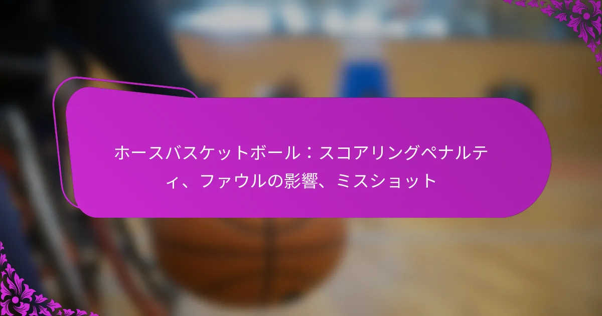 ホースバスケットボールでは、得点ペナルティはルール違反から生じ、選手の得点や機会に影響を与えます。ファウルはゲームのダイナミクスにおいて重要な役割を果たし、しばしば相手に有利な得点チャンスを与えます。さらに、シュートを外すことは選手の得点と自信を低下させ、試合を通じてチーム戦略に影響を及ぼします。 ホースバスケットボールにおける得点ペナルティとは? ホースバスケットボールにおける得点ペナルティは、選手がゲームのルールに違反した場合に発生し、ポイントや機会を失うことにつながります。これらのペナルティを理解することは、公正なプレーを維持し、ゲーム全体のパフォーマンスを向上させるために重要です。 得点ペナルティの定義 ホースバスケットボールにおける得点ペナルティは、選手がペナルティを受ける結果となる違反を指し、通常はポイントを失ったり、次のシュートに制限を受けたりします。これらのペナルティは、不公平またはルールに反する行動から生じることがあります。 一般的な得点ペナルティには、ゲームプレイ中に犯されるファウルが含まれます。たとえば、相手選手との不正な接触やシュートルールの遵守を怠ることです。選手は、得点の可能性に影響を与える不必要なペナルティを避けるために、これらのルールを認識しておく必要があります。 得点ペナルティの例 ホースバスケットボールでは、いくつかの行動が得点ペナルティにつながる可能性があります。以下は一般的な例です: 相手がシュートをしている際にファウルを犯し、相手チームにフリースローを与える。 トラベリング、これは選手がドリブルせずに多くのステップを踏むと発生します。 ダブルドリブル、選手がボールをドリブルし、止まり、再びドリブルを始めることです。 ショットクロックの違反、これによりターンオーバーや得点機会の喪失につながることがあります。 これらの違反は、ゲームの流れを大きく変え、最終的な得点に影響を与える可能性があります。 得点ペナルティがゲームプレイに与える影響 得点ペナルティは、ホースバスケットボールのゲームプレイに深い影響を与える可能性があります。選手がファウルを犯すと、相手チームに得点の機会を与えるだけでなく、ゲームの勢いを変えることにもつながります。 頻繁なペナルティは、選手がゲームから除外される原因となり、チーム全体のパフォーマンスを弱めることがあります。さらに、ファウルを多く犯したチームは、守備戦略に制限を受ける可能性があり、相手が得点しやすくなります。 得点ペナルティを避けるための戦略 得点ペナルティを最小限に抑えるために、選手はゲームプレイ中に特定の戦略を採用するべきです。以下は効果的なヒントです: 個人ファウルに注意を払い、ファウルにつながる攻撃的な守備プレーを避ける。 トラベリングやダブルドリブルの違反を防ぐために、適切なフットワークを練習する。