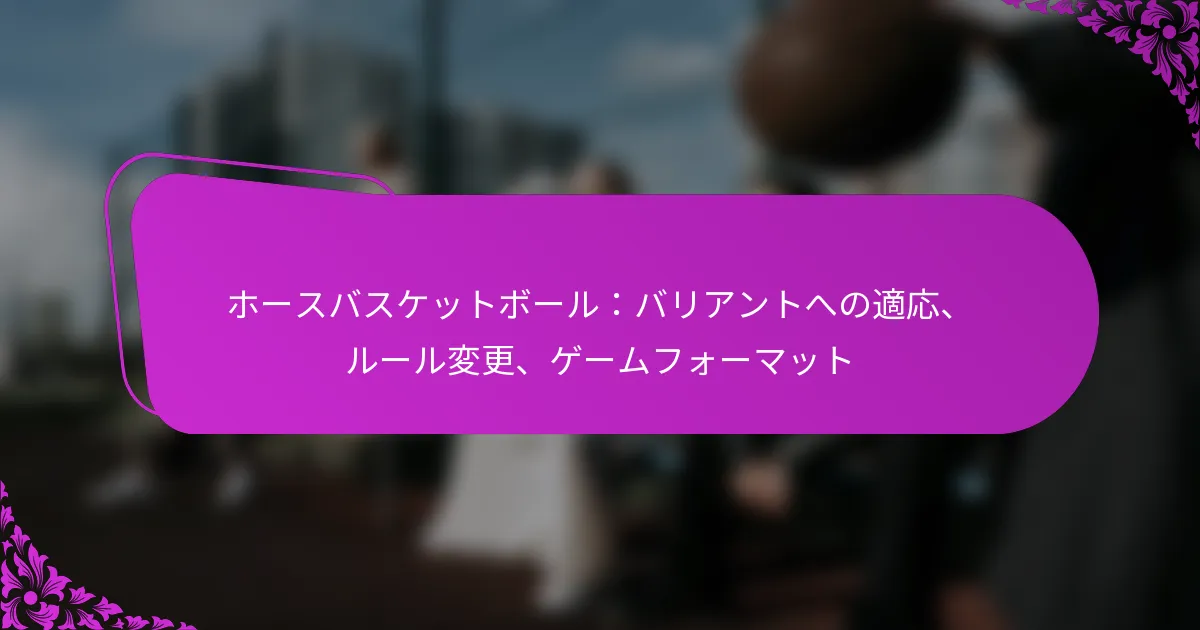 ホースバスケットボールは、プレイアビリティとエンゲージメントを向上させるために、ルールやフォーマットの大幅な進化を遂げてきました。最近の変更は、選手の安全とゲームの流れを優先し、さまざまなフォーマットが異なるスキルレベルに対応し、選手と観客の両方にとってダイナミックな体験を保証しています。 ホースバスケットボールの主な適応点は何ですか? ホースバスケットボールは、プレイアビリティとエンゲージメントを向上させるために、ルール、ゲームフォーマット、選手のスキルを大幅に進化させてきました。主な適応点には、歴史的な変化、地域ごとのゲームプレイの違い、馬術の影響が含まれ、これらすべてが現代のゲームの形を形成しています。 ホースバスケットボールの歴史的進化 ホースバスケットボールは、バスケットボールと馬術の要素を組み合わせた新しいスポーツとして誕生しました。年月が経つにつれて、ゲームは安全性と競争力を向上させるためにさまざまなルール変更を経ており、スポーツの人気の高まりを反映しています。 当初、ゲームは伝統的なバスケットボールに似た基本的なルールを特徴としていましたが、参加者が増えるにつれて、より構造化された規則が導入されました。これには、馬に乗ってプレイする独特のダイナミクスに対応するための得点方法や選手のポジションの調整が含まれます。 ホースバスケットボールの歴史における重要なマイルストーンには、専門的な機器の導入や正式なリーグの設立が含まれ、これによりゲームプレイの標準化とコミュニティのエンゲージメントが促進されました。 ゲームプレイにおける地域的なバリエーション ホースバスケットボールは、地域の文化や馬術の慣習に影響を受けた顕著な地域差を示しています。ある地域では、ゲームがスピードと敏捷性を重視する一方で、他の地域ではチームワークと戦略に焦点を当てています。 北アメリカでは、ホースバスケットボールはしばしばロデオスポーツの要素を取り入れ、より攻撃的なプレースタイルを生み出します。 ヨーロッパのバージョンは、伝統的な馬術トレーニング方法を反映し、精度と調整を優先することがあります。 オーストラリアでは、ゲームがよりリラックスしたフォーマットで行われることがあり、楽しさとコミュニティ参加が強調されます。 これらの地域的なバリエーションは、ゲームの魅力を高めるだけでなく、選手間の多様なスキルセットを促進し、ホースバスケットボールを多才なスポーツにしています。 適応に対する馬術の影響 ホースバスケットボールの適応は、馬場馬術や障害飛越などのさまざまな馬術の影響を強く受けています。これらの分野は、効果的なゲームプレイに必要なライダーのスキルの発展に寄与しています。 たとえば、馬場馬術で訓練を受けたライダーは、プレイ中に馬を操る能力を高める優れたコントロールと精度を示すことがよくあります。同様に、障害飛越から得られるスキルは、コート上での選手の敏捷性とスピードを向上させることができます。 その結果、ホースバスケットボールの選手はしばしば多様な馬術のバックグラウンドを持ち、ゲームに独自の強みを持ち込み、乗馬技術を適応させることができます。 ゲームの適応に対する技術の影響 技術はホースバスケットボールの進化において重要な役割を果たしており、機器からトレーニング方法に至るまで、すべてに影響を与えています。現代の進歩により、選手の安全性とパフォーマンスを向上させるための専門的な鞍や保護具が開発されました。 さらに、ビデオ分析ツールが選手の動きや戦略を評価するためにますます使用されており、ターゲットを絞ったトレーニングとスキル向上を可能にしています。このデータ駆動型のアプローチは、選手が技術をゲームの要求により適応させるのに役立ちます。