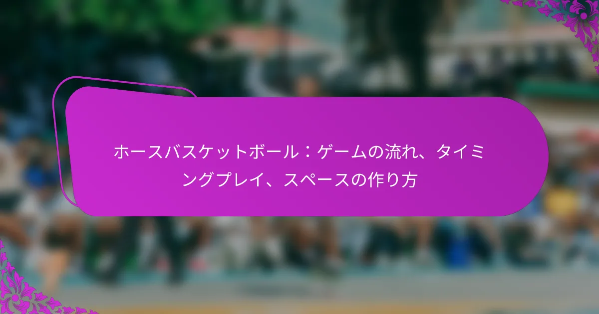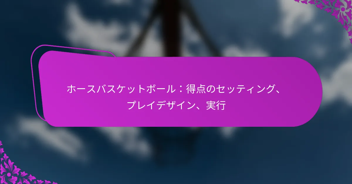 ホースバスケットボールは、バスケットボールのスリルと乗馬の興奮を融合させた革新的なスポーツで、プレイヤーは馬に乗ったままボールをフープにシュートして得点を目指します。成功するためには、チームは馬の敏捷性とライダーのスキルを活かした戦略的な得点セッティングとプレイデザインを開発し、コート上での効果的な動きと連携を確保する必要があります。 ホースバスケットボールとは何か、そして従来のバスケットボールとの違いは何か? ホースバスケットボールは、バスケットボールの要素と乗馬を組み合わせたユニークなスポーツです。従来のバスケットボールが徒歩で行われるのに対し、ホースバスケットボールではプレイヤーが馬に乗りながらボールをフープにシュートして得点を狙います。 ホースバスケットボールの定義と起源 ホースバスケットボールは、バスケットボールのスキルと馬術の能力を融合させたチームスポーツです。プレイヤーは馬に乗り、通常のバスケットボールのフープと同じ高さに設置されたフープにバスケットボールをシュートして得点を目指します。 ホースバスケットボールの起源は20世紀初頭に遡り、さまざまな馬術イベントで人気を博しました。アメリカで広まり、以来、多くの人々に楽しまれる競技として進化しました。 ホースバスケットボールと従来のバスケットボールの主な違い ホースバスケットボールと従来のバスケットボールの主な違いは、移動手段にあります。ホースバスケットボールでは、プレイヤーが馬に乗っているため、ゲームプレイに複雑さが加わります。これには、バスケットボールのスキルだけでなく、乗馬の熟練度も必要です。 もう一つの重要な違いはコートの設定です。ホースバスケットボールは、馬の動きを考慮して、より大きなアリーナや屋外のフィールドで行われることが多いのに対し、従来のバスケットボールは標準的なコートサイズに制限されています。さらに、得点メカニクスもわずかに異なり、異なる距離からのシュートに異なるポイント値が割り当てられることがあります。 ホースバスケットボールを規定するルールとガイドライン ホースバスケットボールには、従来のバスケットボールとは異なる独自のルールがあります。プレイヤーは、ゲーム中に馬とライダーの安全を確保するために特定の乗馬規則を遵守しなければなりません。 一般的なルールには、ドリブルやシュート中に馬をコントロールすることや、プレイヤー間の身体的接触に関する制限が含まれます。ゲームは通常、従来のバスケットボールと同様に、各ハーフに設定された時間制限で行われます。 ホースバスケットボールの一般的なバリエーション ホースバスケットボールには、参加者のスキルレベルや好みに応じてプレイできるいくつかのバリエーションがあります。いくつかのバージョンでは、遠くからのシュートに対して追加ポイントを与えるなど、異なる得点システムが含まれることがあります。 他のバリエーションでは、チームサイズの変更や、コート上に追加の障害物を含めて挑戦を増やすことが考えられます。これらの適応により、ゲームはより魅力的になり、さまざまな観客に適したものになります。 ターゲットオーディエンスとプレイヤーのデモグラフィック ホースバスケットボールは、馬術愛好者、バスケットボールファン、ユニークなレクリエーション活動を求める家族など、多様なオーディエンスを惹きつけます。若者や大人の間で人気があり、コミュニティイベントやフェアでよく見られます。 プレイヤーのデモグラフィックは幅広く、熟練したライダーから乗馬初心者までさまざまです。この包括性により、チームビルディング活動や社交イベントに最適な選択肢となります。 ホースバスケットボールで得点機会を設定する方法は? ホースバスケットボールで得点機会を設定するには、得点のチャンスを最大化するための戦略的な計画とプレイヤーの連携が必要です。効果的なセッティングは、プレイヤーがシュートするための明確な道を作り、コートスペースを効率的に活用します。
