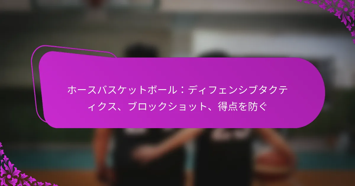 馬のバスケットボールにおいて、守備戦術をマスターすることは、相手チームの得点を阻止するために不可欠です。ポジショニング、コミュニケーション、適応力に焦点を当てることで、選手は効果的にシュートをブロックし、得点機会を防ぐことができます。戦略的なフォーメーションを採用し、チームワークを活用することで、守備能力が向上し、攻撃の動きを予測し、効果的に対抗することが可能になります。 馬のバスケットボールにおける効果的な守備戦術とは? 馬のバスケットボールにおける効果的な守備戦術は、ポジショニング、コミュニケーション、適応力に焦点を当て、相手チームの得点を阻止することを目的としています。戦略的なフォーメーションを採用し、チームワークを活用することで、選手は守備能力を高め、攻撃の動きを予測することができます。 最適な防御のためのポジショニング戦略 ポジショニングは馬のバスケットボールの防御において重要であり、選手が重要なエリアをカバーし、攻撃プレーに迅速に反応することを可能にします。選手はバランスの取れたフォーメーションを維持し、各メンバーが自分の指定されたゾーンと責任を理解していることを確認する必要があります。 ダイヤモンドまたはボックスフォーメーションを利用することで、強力な防御の存在感を生み出し、相手が侵入するのを難しくすることができます。選手はスペーシングにも注意を払い、互いにサポートできる距離を保ちながら、攻撃の動きに反応できるようにする必要があります。 重要なポジショニング戦略には、安定性を高めるために低い姿勢を保ち、馬の動きを利用して迅速に調整することが含まれます。これにより、守備者はギャップを埋め、効果的にシュートに対抗することができます。 チームメイト間のコミュニケーション技術 チームメイト間の効果的なコミュニケーションは、統一された防御の努力に不可欠です。選手は、割り当てを切り替えたり、相手に対するカバーを強化したりする際に、明確な合図や呼びかけを確立する必要があります。 守っている選手の名前を呼ぶなどの口頭の合図を使用することで、意識を維持し、全員が同じ認識を持つことができます。手信号のような非言語的コミュニケーションも効果的であり、特に騒がしい環境では有効です。 コミュニケーションに焦点を当てた定期的な練習セッションは、チームの化学反応を高め、全体的な防御パフォーマンスを向上させることができます。選手は試合中に戦略や調整について話し合うためのオープンな対話を奨励するべきです。 攻撃を打ち消すために設計された特定のプレー 守備プレーは、相手が採用する特定の攻撃戦略に対抗するように調整されるべきです。例えば、「トラップ」ディフェンスは、ボールの動きに依存するチームに対して効果的であり、ターンオーバーを強制し、速攻の機会を生み出します。 もう一つの効果的なプレーは「スイッチ」ディフェンスで、選手が攻撃選手の動きに基づいて割り当てを交換します。これにより、相手チームのリズムが乱れ、プレーを実行するのが難しくなります。 コーチは相手の傾向を分析し、相手の弱点を突くカウンタープレイを開発する必要があります。これらのプレーを定期的に練習することで、選手は試合中に実行する準備が整います。 相手の強みに基づいた戦術の調整 相手チームの強みに基づいて守備戦術を調整することは、馬のバスケットボールでの成功にとって重要です。チームは相手のキープレーヤーとその好ましい攻撃戦略を評価し、それに応じて防御を調整する必要があります。 相手が長距離からのシュートに優れている場合、守備者はシュートをする選手に対して閉じることを優先し、シュートを競り合う必要があります。逆に、相手チームがペイント内で強い場合は、内部防御とリバウンドに焦点を当てることが重要です。 試合の映像を定期的にレビューすることで、チームはパターンを特定し、リアルタイムで戦術を調整することができます。この適応力は、シーズンを通じて守備の効果を大幅に向上させることができます。 馬の動きを利用して守備カバーを強化する