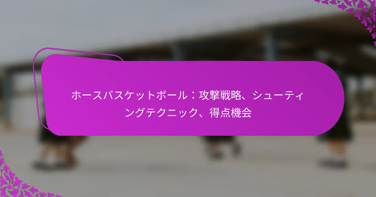 ホースバスケットボールでは、効果的な攻撃戦略がチームワークと適応力を通じて得点機会を最大化するために不可欠です。シューティング技術を習得し、守備の弱点を認識することで、選手はパフォーマンスを向上させ、ゲームプレイ中に有利な状況を活かすことができます。 ホースバスケットボールにおける効果的な攻撃戦略とは? ホースバスケットボールにおける効果的な攻撃戦略は、チームワーク、ポジショニング、適応力を通じて得点機会を最大化することに焦点を当てています。さまざまな技術やフォーメーションを採用することで、チームは相手を出し抜き、自らの強みを活かす有利な状況を作り出すことができます。 最適な得点のためのポジショニング技術 ポジショニングは、ホースバスケットボールにおける得点機会を創出するために重要です。選手は混雑を避け、明確なパスレーンを確保するためにスペーシングを維持する必要があります。これは、コート全体に広がりながらボールとディフェンダーに注意を払うことを含みます。 効果的なポジショニングは、バスケットに向かってカットするタイミングやスクリーンを設定するタイミングを知ることも意味します。選手は、迅速かつ決定的な動きでディフェンダーを意図した得点エリアから引き離すことで、オープニングを作り出すことができます。 さらに、ポジションを取る際に重心を低く保つことで、プレイの変化に迅速に反応でき、パスを受けたりシュートを打ったりするのが容易になります。 成功するプレイのためのチームワークのダイナミクス ホースバスケットボールでは、チームワークが不可欠であり、選手が効果的に動きや戦略を調整できるようにします。コート上でのコミュニケーションは、選手が互いの意図を理解するのに役立ち、スムーズなプレイとより良い実行につながります。 信号やコールのシステムを利用することでチームワークが強化され、選手はパス、カット、スクリーンを設定するタイミングを知ることができます。このレベルの調整はディフェンダーに混乱をもたらし、得点チャンスを生み出します。 さらに、各選手の強みと弱みを理解することで、チームは独自のスキルを活かしたプレイを考案し、より一体感のある攻撃戦略を育むことができます。 相手を出し抜く方法 ホースバスケットボールで相手を出し抜くには、敏捷性、戦略、迅速な意思決定の組み合わせが必要です。選手はディフェンスを読み、ギャップを特定して効果的に活用することに焦点を当てるべきです。 フェイクや欺瞞的な動きを使用することで、ディフェンダーを誤解させ、シュートやパスのためのスペースを作ることができます。たとえば、タイミングよくポンプフェイクを行うことで、ディフェンダーをポジションから引き離し、より簡単な得点機会を得ることができます。 さらに、速いペースを維持することでディフェンダーのバランスを崩し、プレイを予測して反応するのを難しくします。攻撃と守備の間の迅速な移行は、相手のポジショニングの隙を突くことができます。 一般的に使用される攻撃フォーメーション ホースバスケットボールでは、得点の可能性を高めるためにいくつかの攻撃フォーメーションが一般的に使用されます。1-4フォーメーションでは、1人の選手がトップに位置し、4人がベースラインに広がることで、効果的なボールムーブメントとスペーシングを実現します。 2-3フォーメーションでは、2人の選手がトップに、3人がサイドに配置され、迅速なパスと外からのシュートの機会を促進します。このセットアップはディフェンスを引き伸ばし、バスケットへのドライブのためのオープニングを作り出します。 もう一つの人気のあるフォーメーションはピックアンドロールで、1人の選手がチームメイトのためにスクリーンを設定し、彼らがバスケットにドライブするかシュートを打つことを可能にします。このダイナミクスはディフェンダーのミスマッチや混乱を生み出すことができます。 選手の強みに基づいた戦略の適応