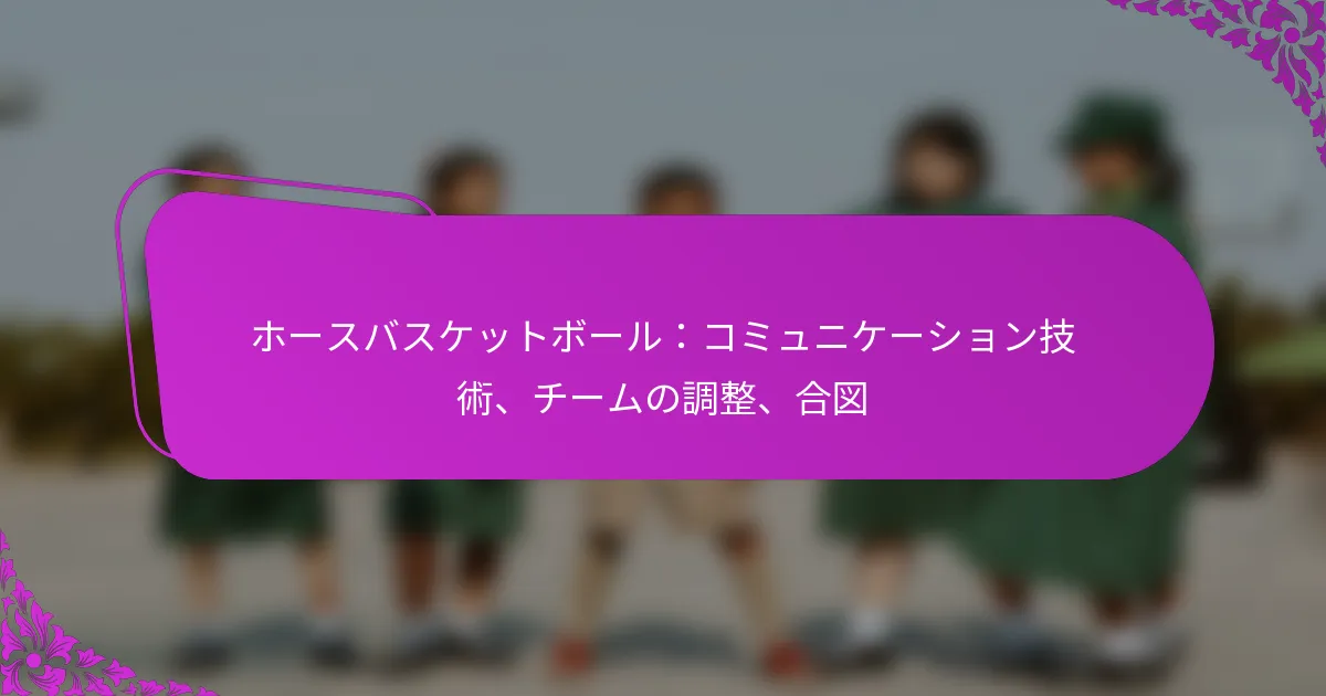 ホースバスケットボールでは、効果的なコミュニケーション技術が、シームレスなチームの調整とゲームプレイの向上に不可欠です。言葉による合図と非言語的な合図の両方を活用することで、選手たちはお互いの意図や戦略をよりよく理解し、コート上でのパフォーマンスを向上させることができます。 ホースバスケットボールにおける効果的なコミュニケーション技術とは? ホースバスケットボールにおける効果的なコミュニケーション技術は、チームの調整と成功したゲームプレイを確保するために不可欠です。これらの技術は、試合中に選手が互いの意図や戦略を理解するのに役立つ言葉による合図と非言語的な合図の両方を含みます。 チーム調整のための言語コミュニケーション戦略 言語コミュニケーションは、ホースバスケットボールにおけるチームメンバー間の行動や戦略を調整するために重要です。明確で簡潔な言葉は、選手が迅速に決定を下し、コート上での変化する状況に効果的に対応するのに役立ちます。 チームは、全メンバーが理解できる特定の用語やフレーズを確立すべきです。これにより混乱が減り、ゲームプレイ中に全員が同じ認識を持つことができます。 「パス」、「シュート」、「ディフェンド」などの短いコマンドを使用して、即時の行動を伝えます。 選手が「オープンです」や「カバーして!」など、自分の位置や意図を呼びかけることを奨励します。 プレイやフォーメーションを指定するために数字や色を取り入れ、複雑な戦略を迅速にコミュニケーションできるようにします。 非言語的な合図とその重要性 非言語的な合図はホースバスケットボールにおいて重要な役割を果たします。これらはゲームの流れを妨げることなくメッセージを伝えることができます。身体の動き、目の接触、手のジェスチャーは、意図や戦略を効果的に示すことができます。 選手は、言語コミュニケーションを補完する非言語的な合図のセットを開発すべきです。この二重のアプローチは、チームメンバー間の理解と応答性を高めます。 言語コミュニケーションが不可能な場合に使用できるプレイやフォーメーションのための手の合図を確立します。 目の接触を利用して、準備ができていることや戦略の変更を示します。 身体の位置に注意を払い、例えば、チームメイトに向かっていることはパスを受け取る準備ができていることを示すことができます。 ゲームプレイ中に使用される一般的なフレーズと呼びかけ ゲームプレイ中に一般的なフレーズや呼びかけを使用することで、選手は迅速かつ効率的に反応できます。これらの用語に慣れることで、チームのパフォーマンスが大幅に向上します。 選手は、試合中に本能的に使用できるように、これらのフレーズを定期的に練習すべきです。いくつかの例を挙げます: 「ブレイク!」 –