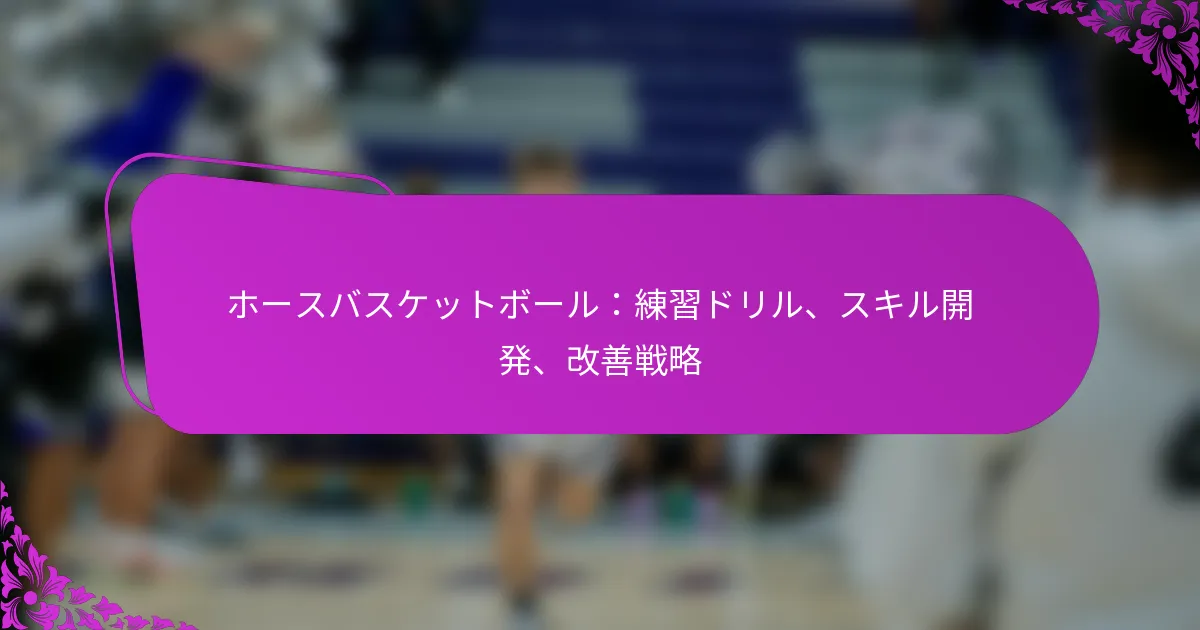 ホースバスケットボールは、馬術スポーツのスリルとチームプレイの興奮を組み合わせており、馬とライダーが調和して働くことを必要とします。効果的な練習ドリルは、シューティング精度、パススキル、全体的なコーディネーションを向上させるために不可欠であり、ライディング技術とコミュニケーションに焦点を当てたトレーニングはチームワークを育みます。メンタルコンディショニングやパフォーマンス分析などの改善戦略を取り入れることで、プレイヤーはゲームを向上させ、コートでの成功を収めることができます。 ホースバスケットボールの効果的な練習ドリルとは? ホースバスケットボールの効果的な練習ドリルは、シューティング精度の向上、パススキルの改善、馬とライダーの間のコーディネーションの発展、チームプレイの戦略化、コンディショニングとスタミナの構築に焦点を当てています。さまざまなドリルを取り入れることで、全体的なパフォーマンスの大幅な改善が期待できます。 シューティング精度を向上させるためのドリル ホースバスケットボールでシューティング精度を向上させるためには、ターゲット練習と一貫性を強調するドリルに焦点を当てます。効果的なドリルの一つは「ターゲットシュート」で、ライダーは馬をコントロールしながらバックボードやフープの特定のターゲットを狙います。これにより、精度と自信が養われます。 もう一つの有用な技術は「フリースロー挑戦」で、ライダーは特定の動作を行った後、指定された場所からシュートの練習をします。これにより、ゲームの状況をシミュレートし、正確なシュートのための筋肉記憶を構築します。 シューティングフォームを評価し、必要な調整を行うために、ビデオ分析などのフィードバックメカニズムを取り入れます。これらのドリルを定期的に練習することで、実際のゲームでのシューティングパーセンテージが向上する可能性があります。 パススキルを向上させるためのドリル パススキルはホースバスケットボールにおいて重要であり、ドリルは精度とタイミングに焦点を当てるべきです。「パートナーパス」ドリルでは、2人のライダーが障害物を避けながらボールをパスし合います。これにより、手と目のコーディネーションが発展し、迅速な意思決定能力が向上します。 「動くターゲットパス」ドリルでは、一方のライダーが動きながら、もう一方がボールをパスします。これにより、プレイヤーが動いているチームメイトにパスをする必要があるゲームシナリオをシミュレートし、パスの精度と馬とライダー間のコミュニケーションを向上させます。 パススキルをさらに洗練させるために、練習セッションで異なる距離や角度を取り入れます。この変動性は、ゲーム中に遭遇する可能性のあるさまざまな状況に備えるのに役立ちます。 馬とライダーの間のコーディネーションを発展させるためのドリル 馬とライダーの間のコーディネーションは、ホースバスケットボールでの効果的なプレイに不可欠です。「障害物コース」ドリルでは、ライダーがコントロールを維持しながらシュートやパスの準備をする際に、馬がナビゲートしなければならない一連のコーンや障害物を設定します。これにより、身体的および精神的なコーディネーションが向上します。 もう一つの効果的なドリルは「タイムドリレー」で、ライダーは馬と共にコーンをくぐり抜けたり、設定された時間内にシュートを決めたりする一連のタスクを完了しなければなりません。これにより、同期が促進され、馬とライダーの間の信頼が築かれます。 これらのコーディネーションドリルを定期的に練習することで、ゲーム中の動きがスムーズになり、全体的なパフォーマンスが向上します。 チームプレイ戦略のためのドリル チームプレイ戦略は、チームワークとコミュニケーションを促進する特定のドリルを通じて強化できます。「フォーメーションドリル」では、チームがユニットとして移動しながら異なるフォーメーションを練習します。これにより、プレイヤーはゲーム中の役割とポジションを理解します。 「スクリメージドリル」は実際のゲーム条件をシミュレートし、チームが攻撃および防御戦略を練習することを可能にします。このドリルは、プレイヤーが効果的にコミュニケーションを取り、お互いのプレイスタイルに適応することを促します。 ドリル後に戦略の議論を取り入れることで、チームの結束とゲームプレイ戦術の理解がさらに強化され、競技環境でのパフォーマンスが向上します。 コンディショニングとスタミナのためのドリル