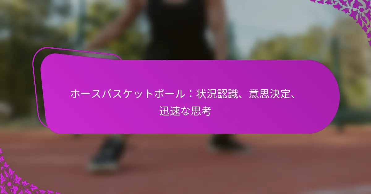ホースバスケットボールは、伝統的なバスケットボールのスリルと乗馬の独特な課題を組み合わせており、プレイヤーは強い状況認識を発展させる必要があります。このスキルにより、ゲームのダイナミクス、チームメイトや対戦相手の位置を評価することができ、効果的な意思決定に不可欠です。迅速な思考はパフォーマンスをさらに向上させ、プレイヤーが得点機会や成功したプレイにつながる迅速で情報に基づいた選択を行うことを可能にします。 ホースバスケットボールにおける状況認識とは何ですか? ホースバスケットボールにおける状況認識とは、チームメイト、対戦相手、ボールの位置を含むゲームのダイナミクスを認識し理解する能力を指します。この認識は、ゲームの結果に影響を与える迅速で情報に基づいた意思決定を行うために重要です。 状況認識の定義 状況認識とは、環境要素や出来事を認識し、それらの意味を理解し、将来の状態を予測することです。ホースバスケットボールでは、プレイヤーの位置、ボールの位置、全体のゲームの流れを認識することが含まれます。この認識により、プレイヤーはコート上の変化する状況に効果的に反応することができます。 それは、観察、理解、予測という3つの重要なプロセスを含みます。プレイヤーは周囲を観察し、見たことの意味を理解し、現在の行動に基づいて将来のシナリオを予測する必要があります。 ゲームプレイにおける状況認識の重要性 状況認識はホースバスケットボールにおける効果的なゲームプレイにとって不可欠であり、チームのパフォーマンスに直接影響を与えます。高い状況認識を持つプレイヤーは、対戦相手の動きを予測し、得点機会を創出し、潜在的なターンオーバーを避けることができます。この積極的なアプローチは、より良いチームワークと調整につながります。 さらに、状況認識はプレイヤーがプレッシャーの下で冷静さを保つのに役立ちます。ゲームのダイナミクスを理解することで、パス、シュート、ディフェンスを行うタイミングなど、迅速な意思決定が可能になり、競争力を高めます。 状況認識の構成要素 観察:ゲームを積極的に観察し、プレイヤーの動き、ボールの位置、潜在的な脅威を記録すること。 理解:観察した行動の意味を理解し、それがゲームにどのように影響するかを把握すること。 予測:現在のゲームプレイに基づいて将来の展開を予測し、積極的な意思決定を可能にすること。 各構成要素は、プレイヤーの状況認識を発展させる上で重要な役割を果たします。たとえば、効果的な観察はより良い理解につながり、それが将来のシナリオを正確に予測する能力を高めます。 状況認識が意思決定に与える影響 状況認識はホースバスケットボールにおける意思決定に大きな影響を与え、プレイヤーに迅速な選択を行うために必要な情報を提供します。プレイヤーが周囲を認識していると、選択肢を迅速に評価し、最も効果的な行動を選ぶことができます。 たとえば、オープンなチームメイトに気づいたプレイヤーは、迅速にパスを出すことができ、得点のチャンスを高めます。逆に、状況認識が不足していると、密に守られている状態でシュートを試みたり、対戦相手の動きを予測できなかったりするなど、悪い決定につながる可能性があります。 状況認識における一般的な誤り チームメイトを見落とす:チームメイトの位置を認識できないと、機会を逃すことになります。 ボールに過度に集中する:ボールだけに集中すると、周囲を無視することになります。